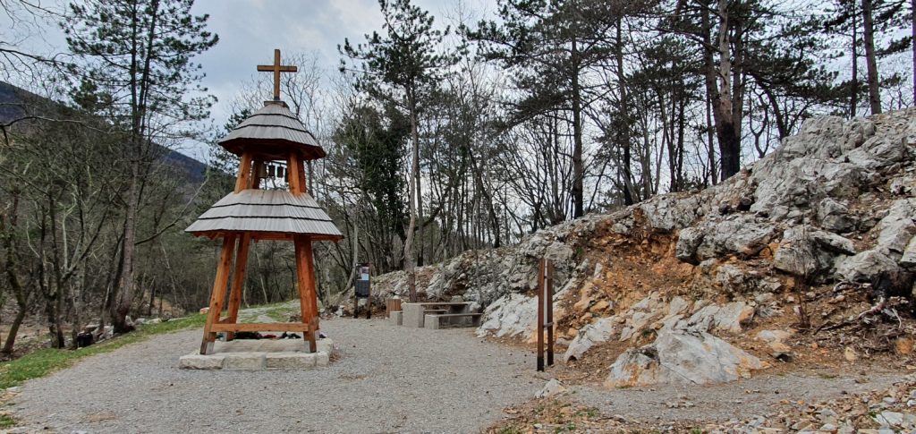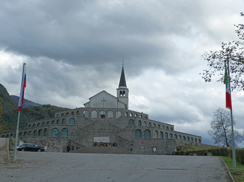 - Kapelico Sv. Duha, ki so jo v arhitekturni manieri dunajskega secesističnega sloga leta 1916 zgradili avstro-ogrski vojaki, so prvič obnovile italijanske enote leta 1934, leta 1957 pa se je manjših vzdrževalnih del lotil Tolminski muzej. V 60. letih jo je kot spomenik evidentiral Zavod za spomeniško varstvo, a je zaradi pomanjkanja sredstev in prepovedi oblasti, da bi obnovo financirala Katoliška cerkev, ostala v slabem stanju (Štepec 2024: 30). Prva obsežnejša obnova je bila izvedena šele med letoma 1980 in 1982. Leta 1999 je bila razglašena za kulturni spomenik državnega pomena, leta 2007 pa je prejela znak evropske dediščine; danes je promovirana kot spomenik sprave, kraj evropskega spomina in osrednji pomnik Poti miru. Nad cerkvenim vhodom se namreč dviga zvonik s sončno uro, grbom avstro-ogrske monarhije in napisom PAX (mir). Zunanjost krasijo grbi osemnajstih dežel Avstro-Ogrske ter Reke in Trsta, notranjost pa barvite poslikave. Na hrastovih ploščah, ki se odpirajo kot listi knjige, je vžganih 2565 imen avstro-ogrskih vojakov različnih narodnosti, ki so padli na bližnjih vrhovih. ↩︎